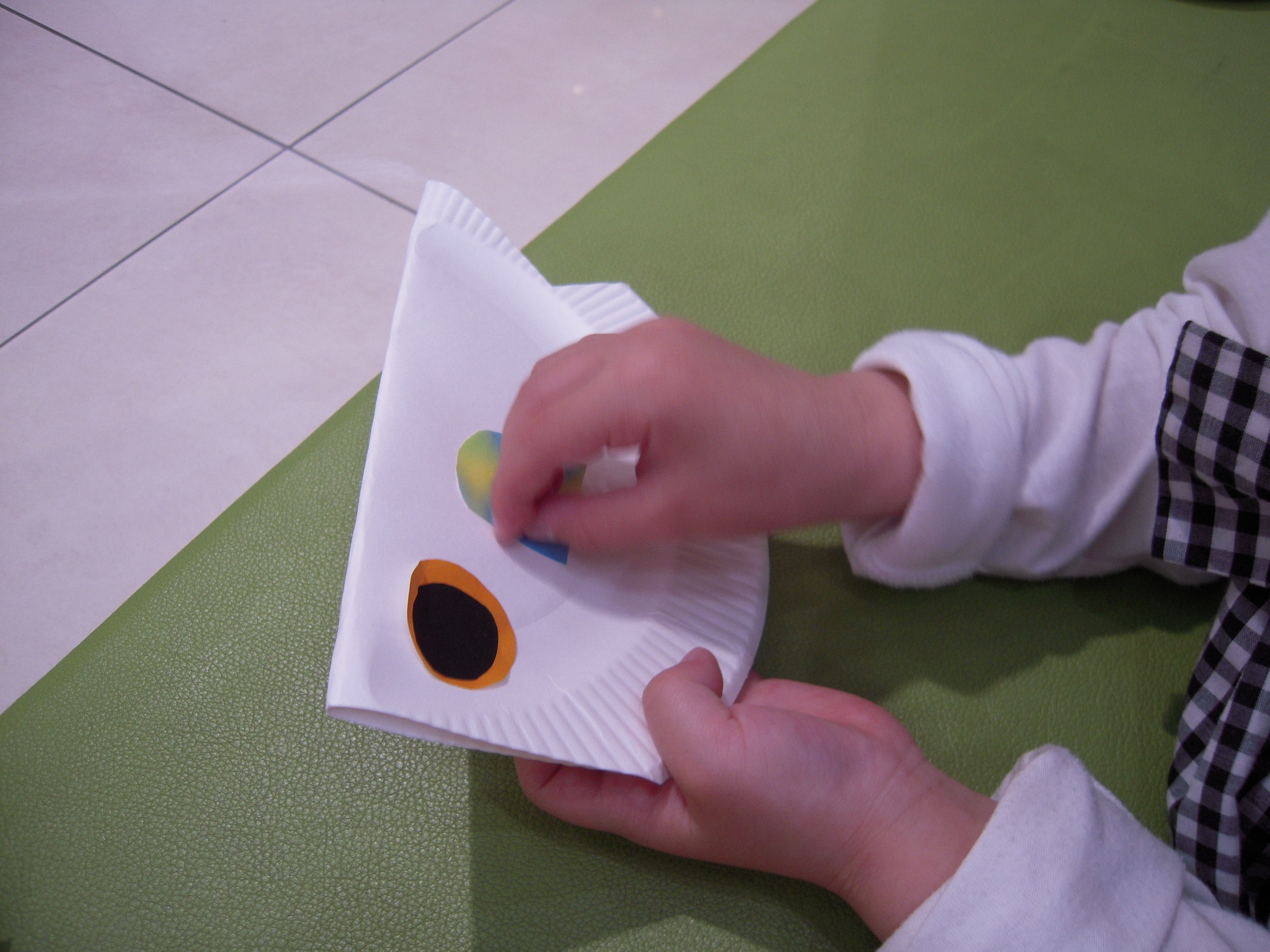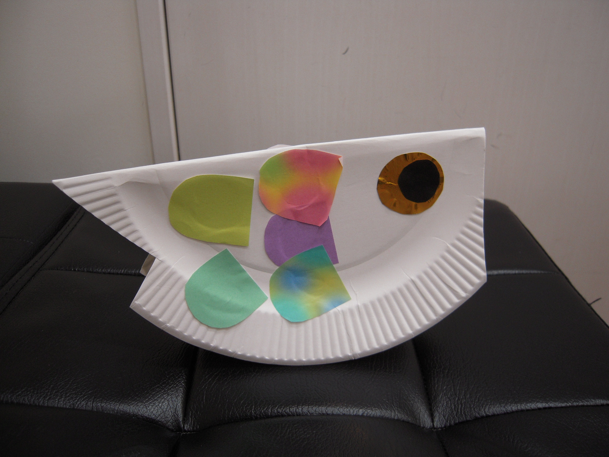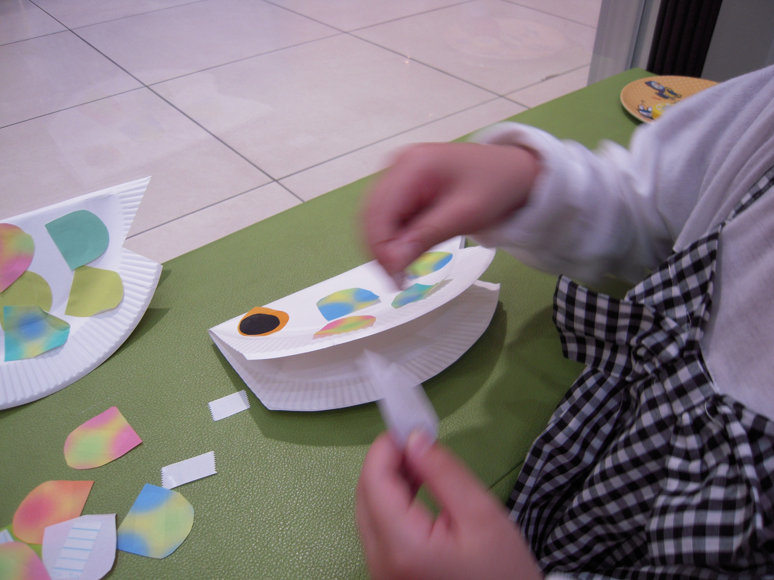 紙皿をこいのぼりの形に切り、両面テープで目や鱗を貼りました。