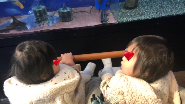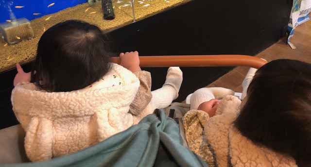 すぐ泣き止んで近所のミニ水族館に連れて行くと興味津々